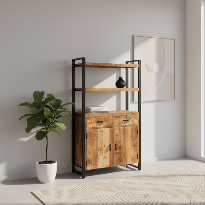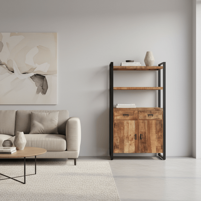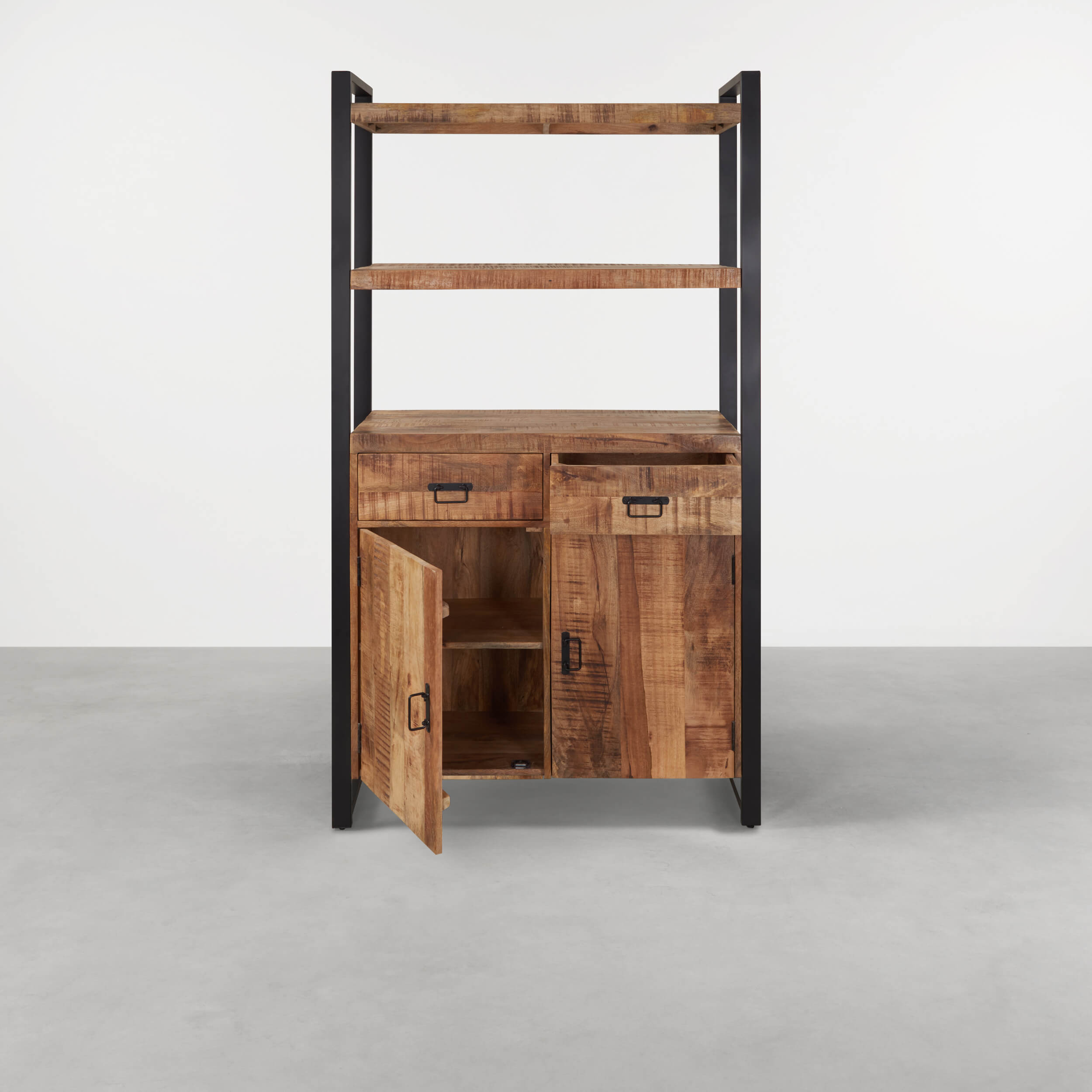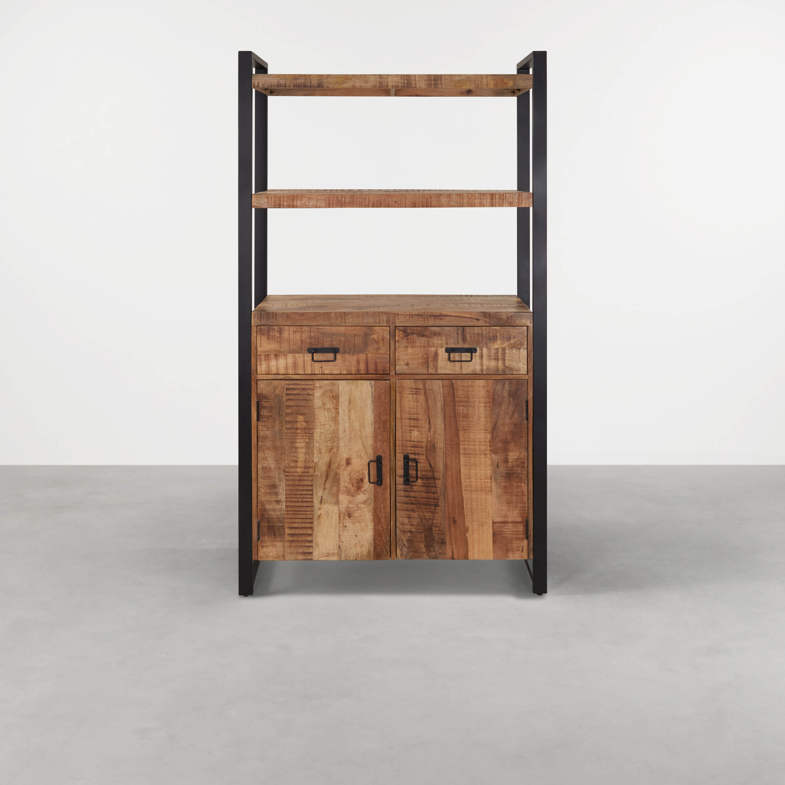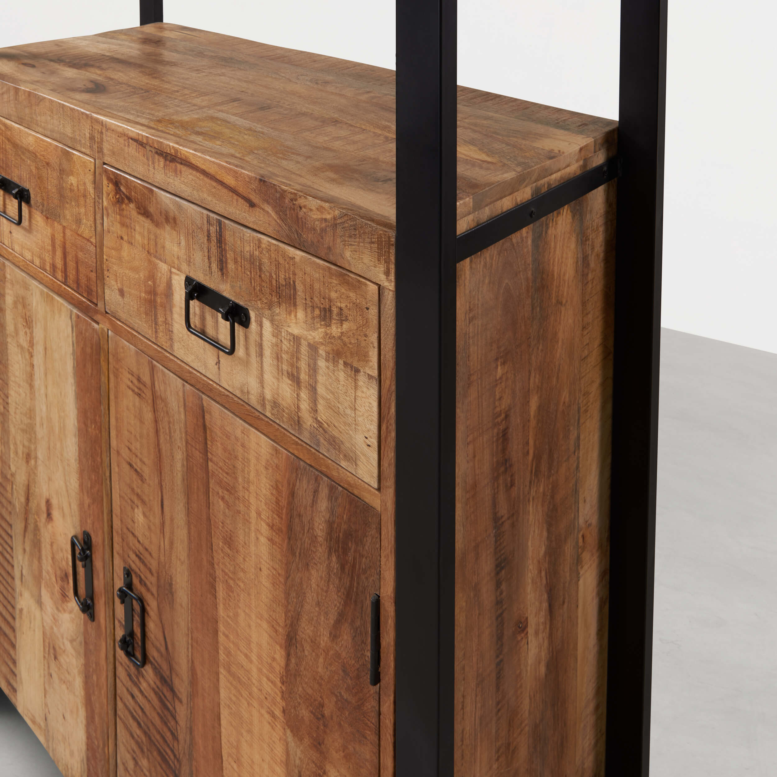 Deze mangohouten Britt boekenkast XXL van 200 cm combineert warme houttinten met een stoer zwart frame. Met lades, deuren én zwevende planken is hij perfect als boekenkast, opbergkast of blikvanger in je interieur.