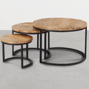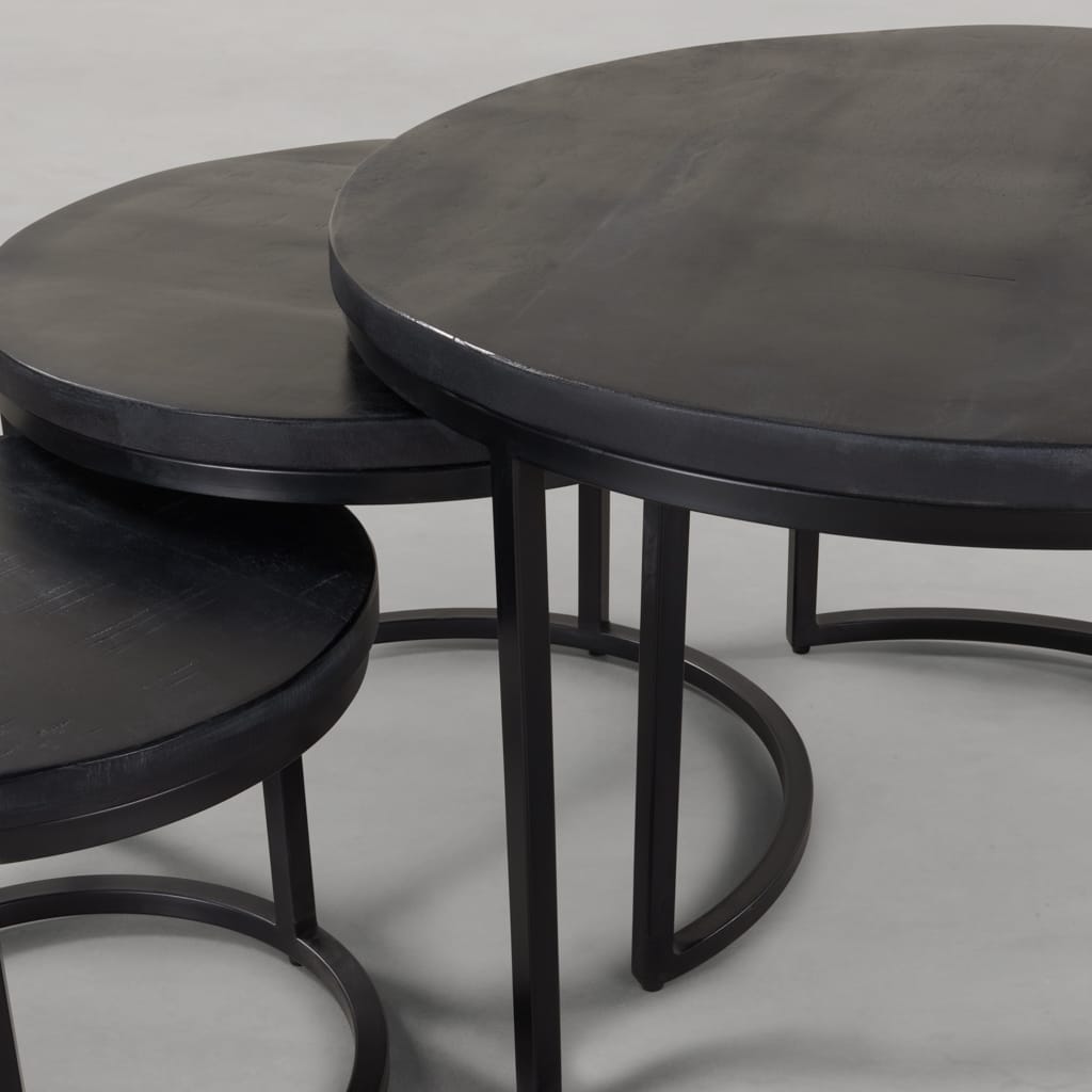 Deze ronde salontafel set in zwart mangohout bestaat uit drie tafels die je volledig onder elkaar kunt schuiven. Het eenvoudige ronde frame en de diepe zwarte afwerking geven deze set een krachtige, moderne uitstraling. De grootste tafel heeft een diameter van 74cm, waardoor deze set perfect is voor ruimere woonkamers of als opvallende aanvulling op je zithoek.